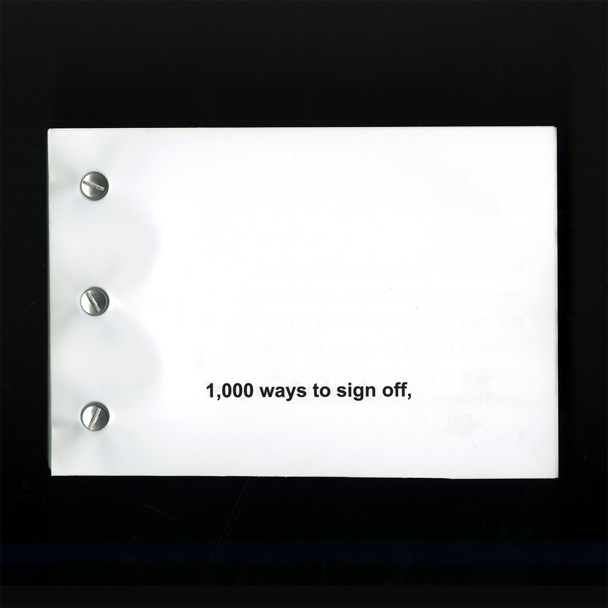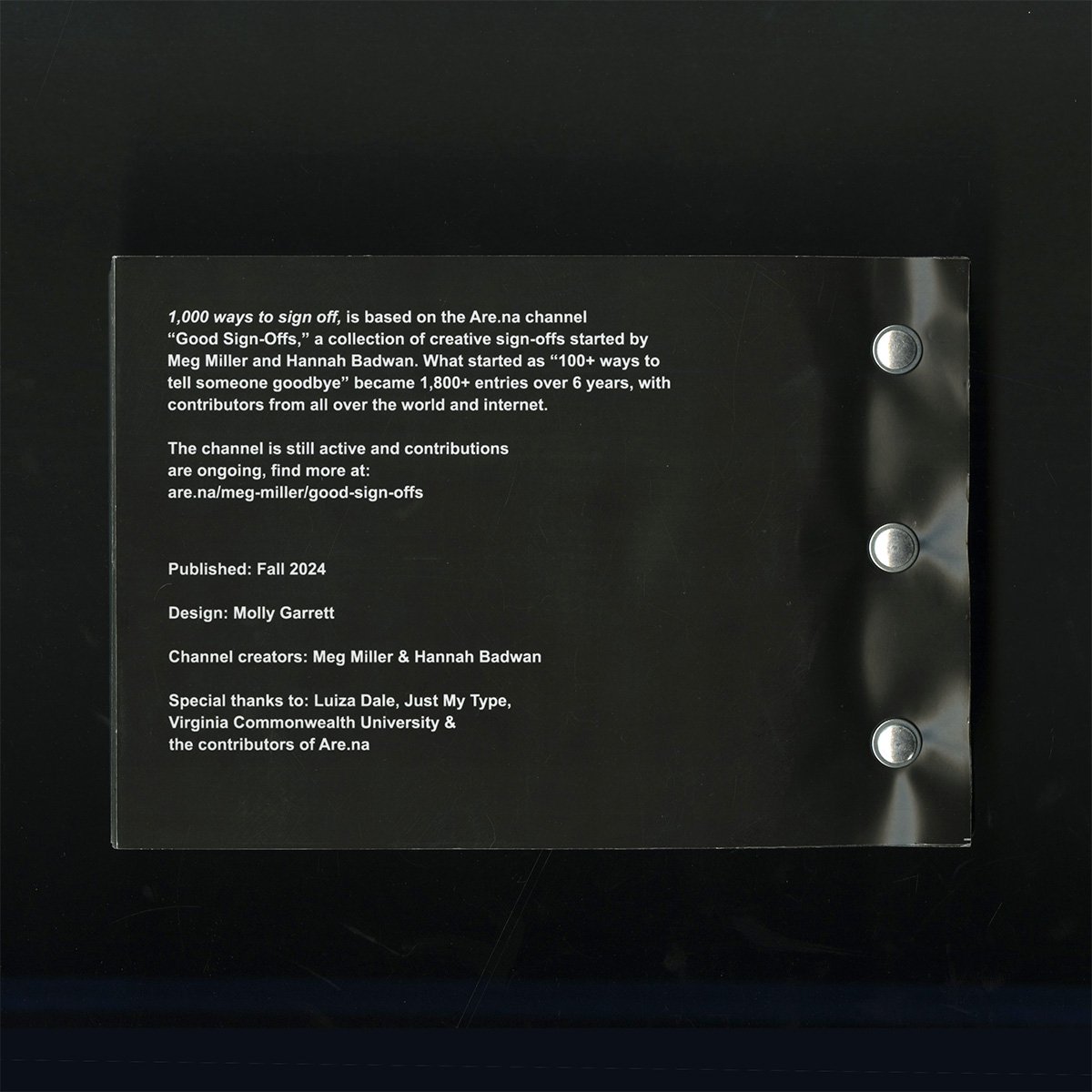 1,000 Ways to Sign Off, is based on the are.na channel “Good Sign-offs” originally created by Meg Miller and Hannah Badwan. This are.na channel has grown to a collection of 1600+ entries from people all over the world and internet. It is a collection of alternative, genuine, and more meaningful ways to say goodbye. Collecting 1,000 sign offs from this channel, this book is organized from loving to hostile.
