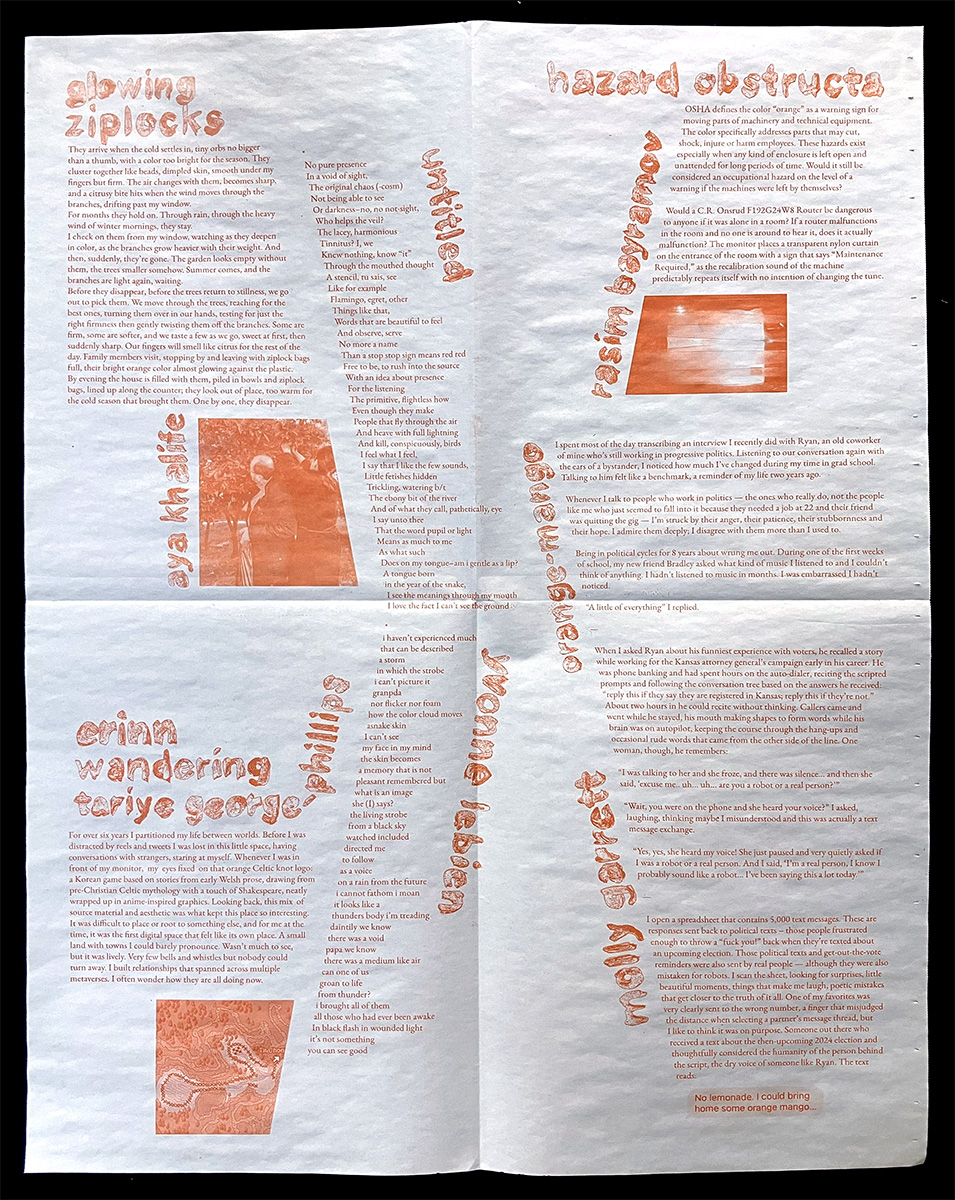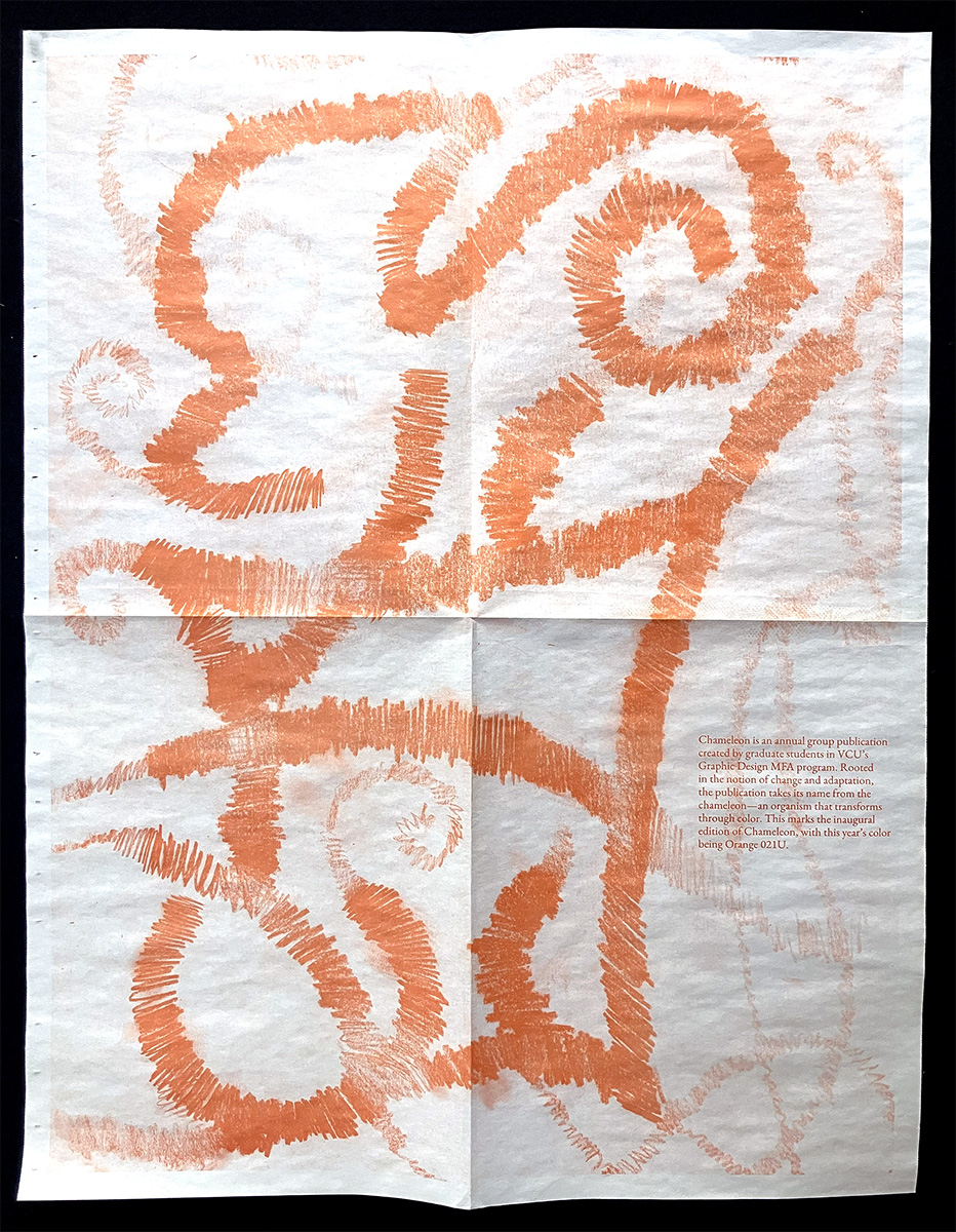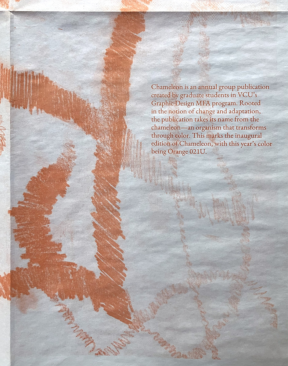 Chameleon is a publication produced by the VCU Graphic Design MFA students in their second year. Each year a color is chosen and each student writes using that color as a guide. In 2025, the color was Orange 021U.