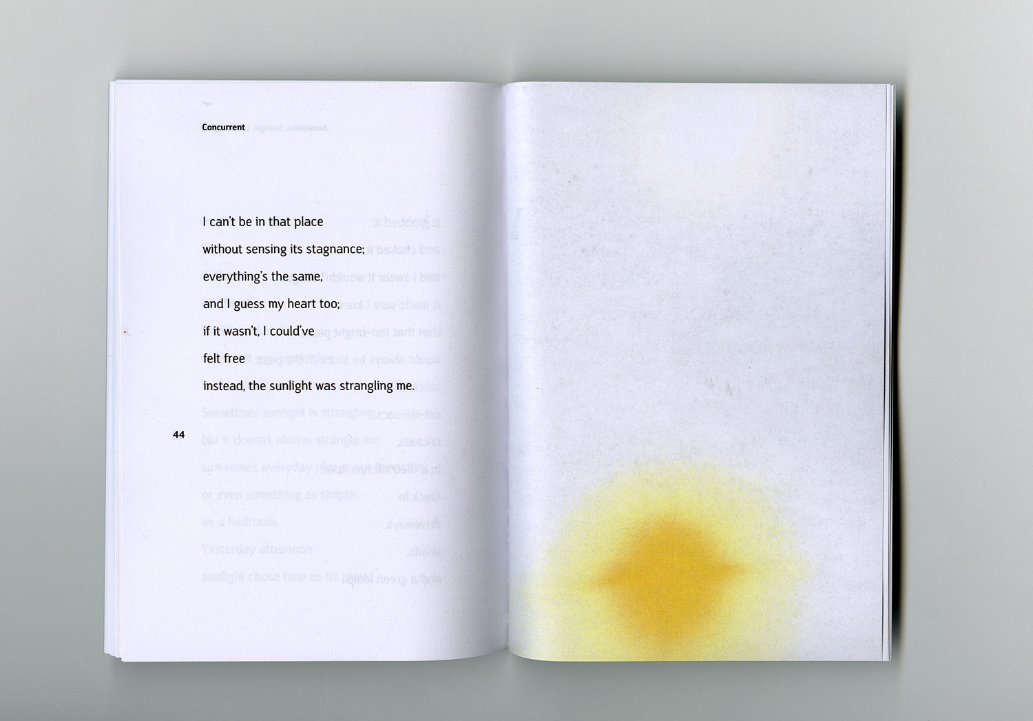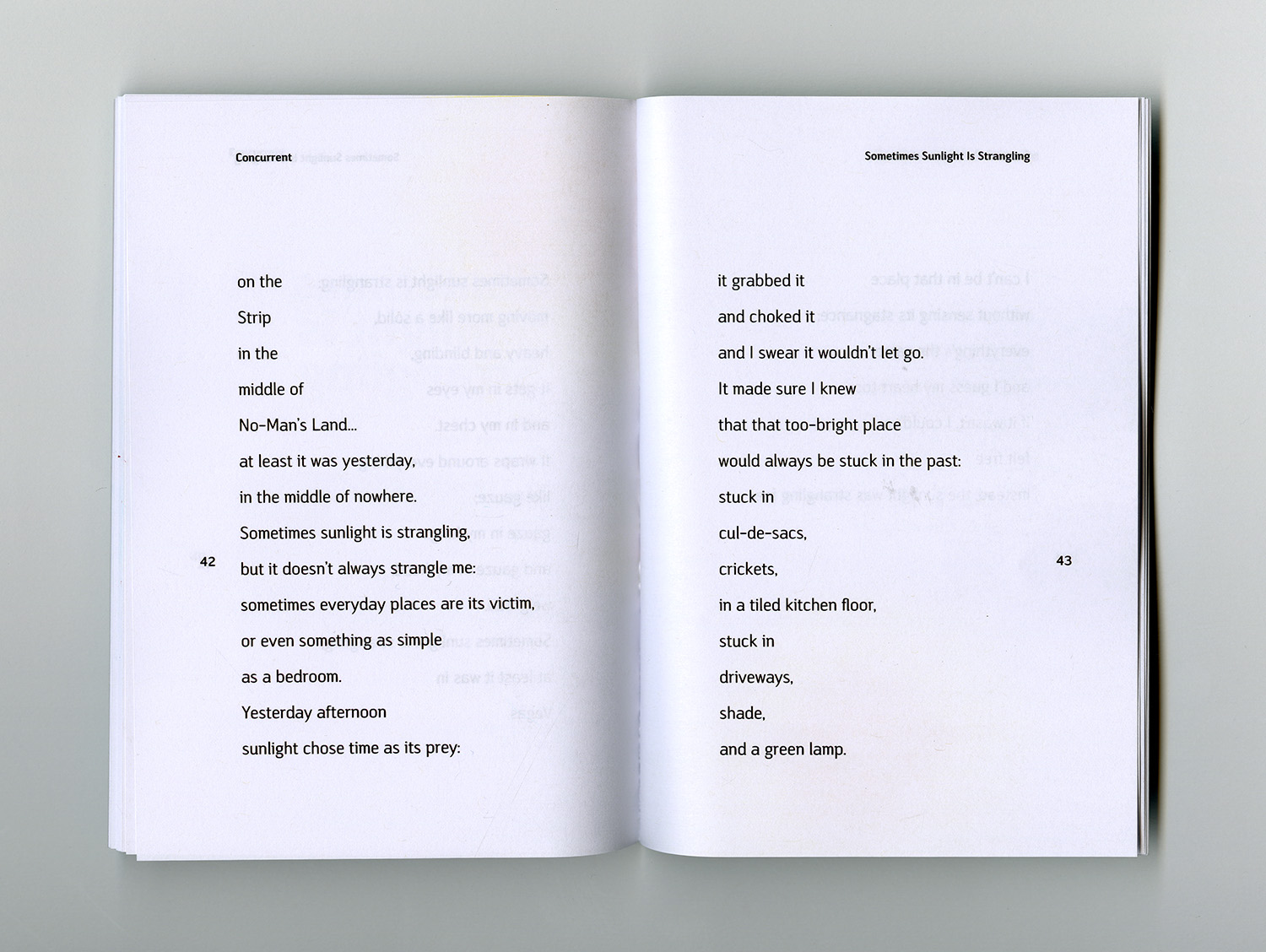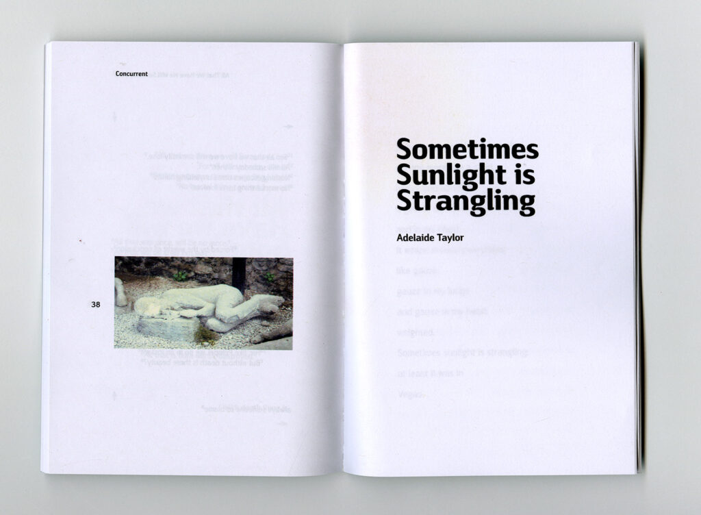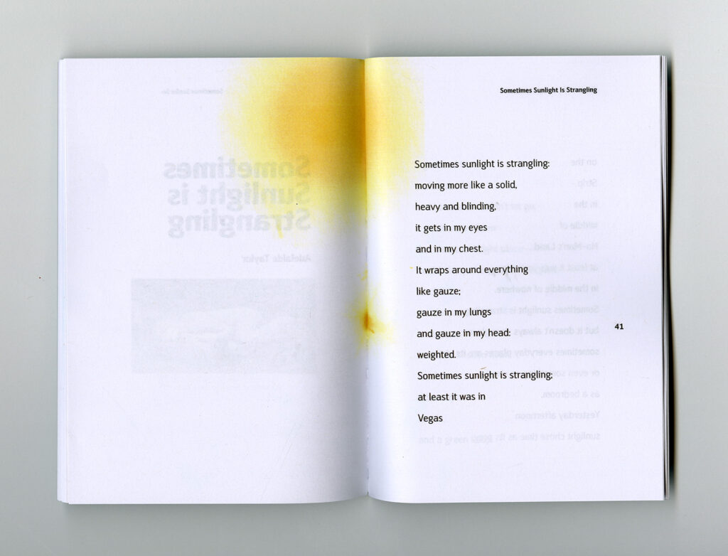 This book was a collaboration between VCU’s graduate graphic design department and Richmond Young Writers, an extracurricular writing program for teenagers. Each writer was paired with a designer who typeset, designed and compiled their poem into a final book. I was paired with Adelaide Taylor and designed her piece Sometimes Sunlight is Strangling.
