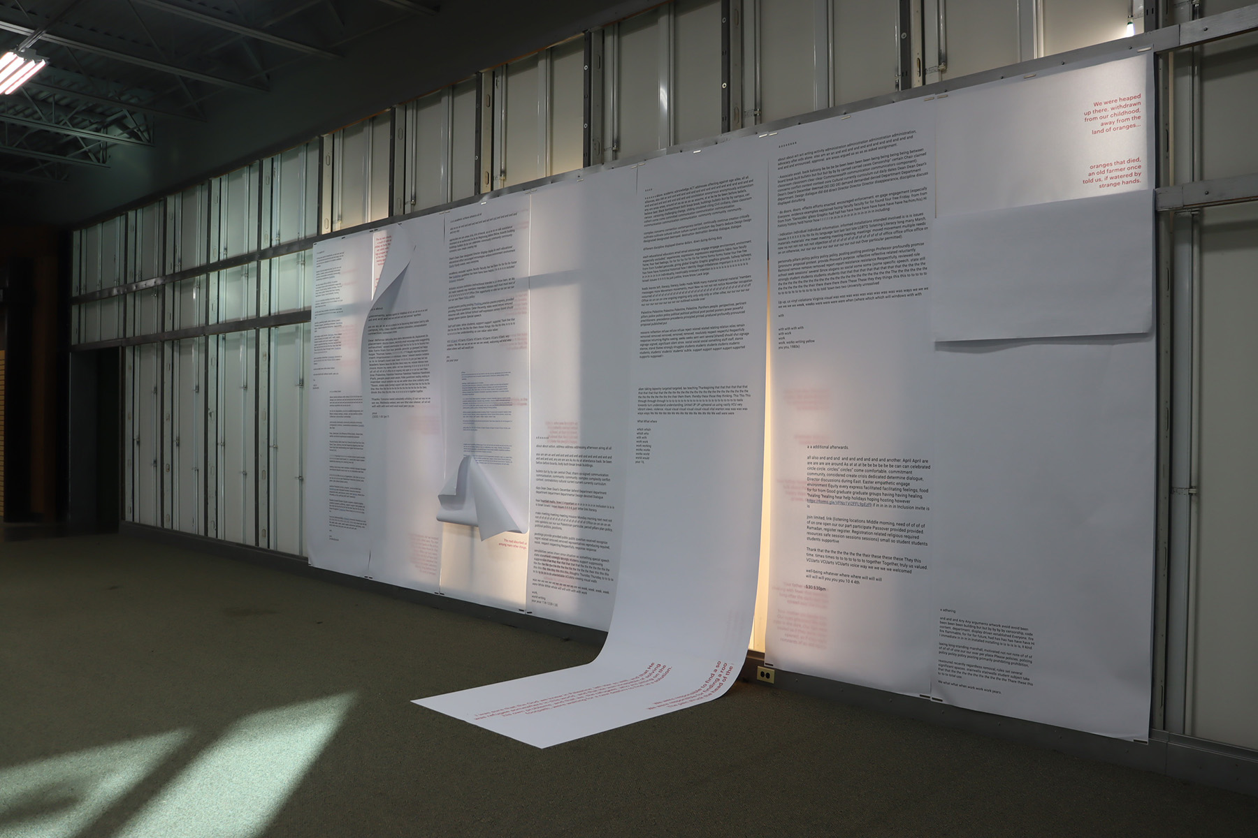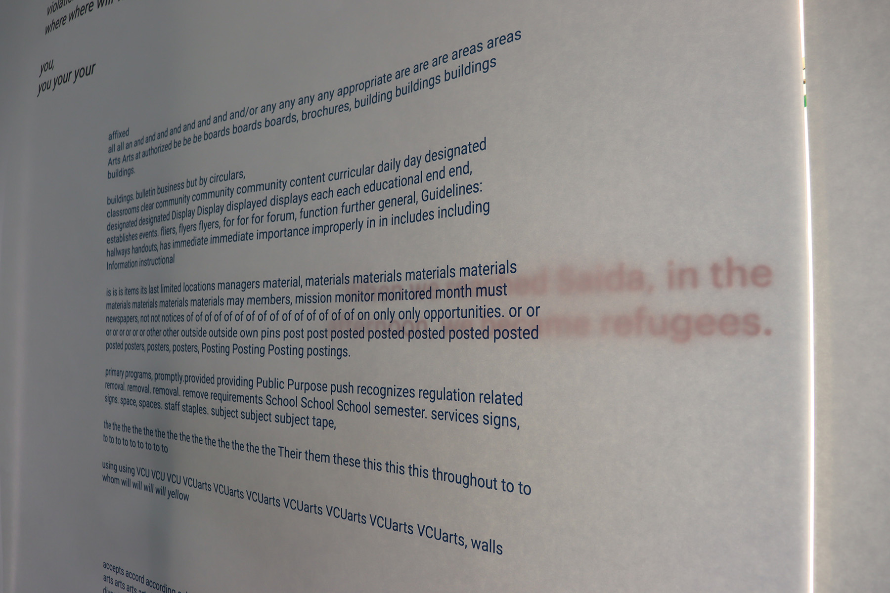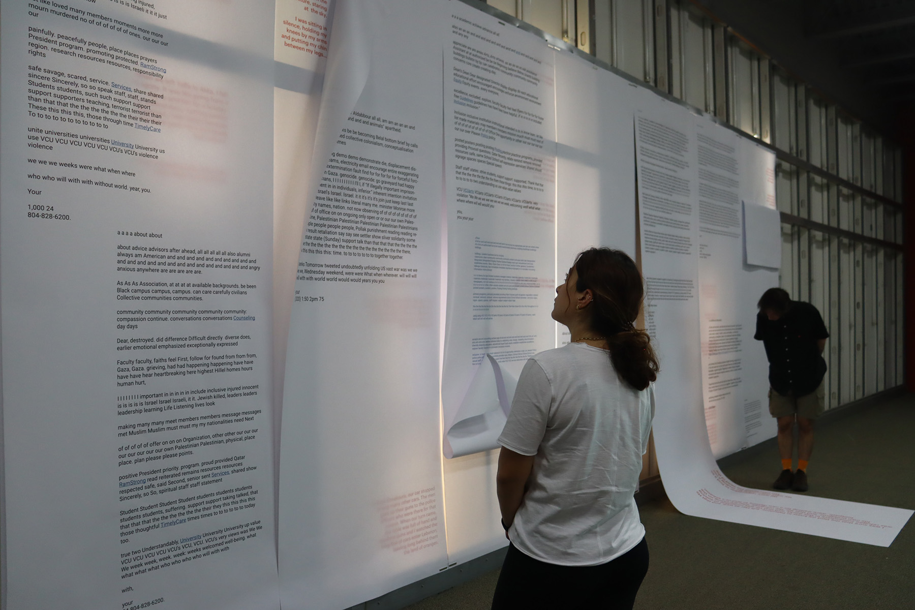 text sourced from VCU administration & faculty emails mentioning the war & Ghassan Kanafani’s “Sad Oranges” excerpts, large format prints