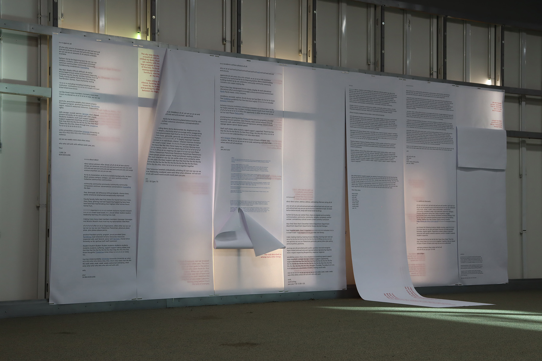 For this project, I collected all the emails I had received, from administration and faculty, about the war in Palestine during my first year in graduate school. I organized that language as a data set, breaking it apart piece by piece, word by word. I examined the power of these words and then tried to make a different sense of them — a different order — and printed them alphabetically.