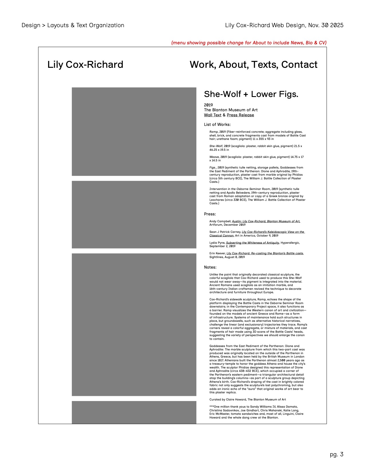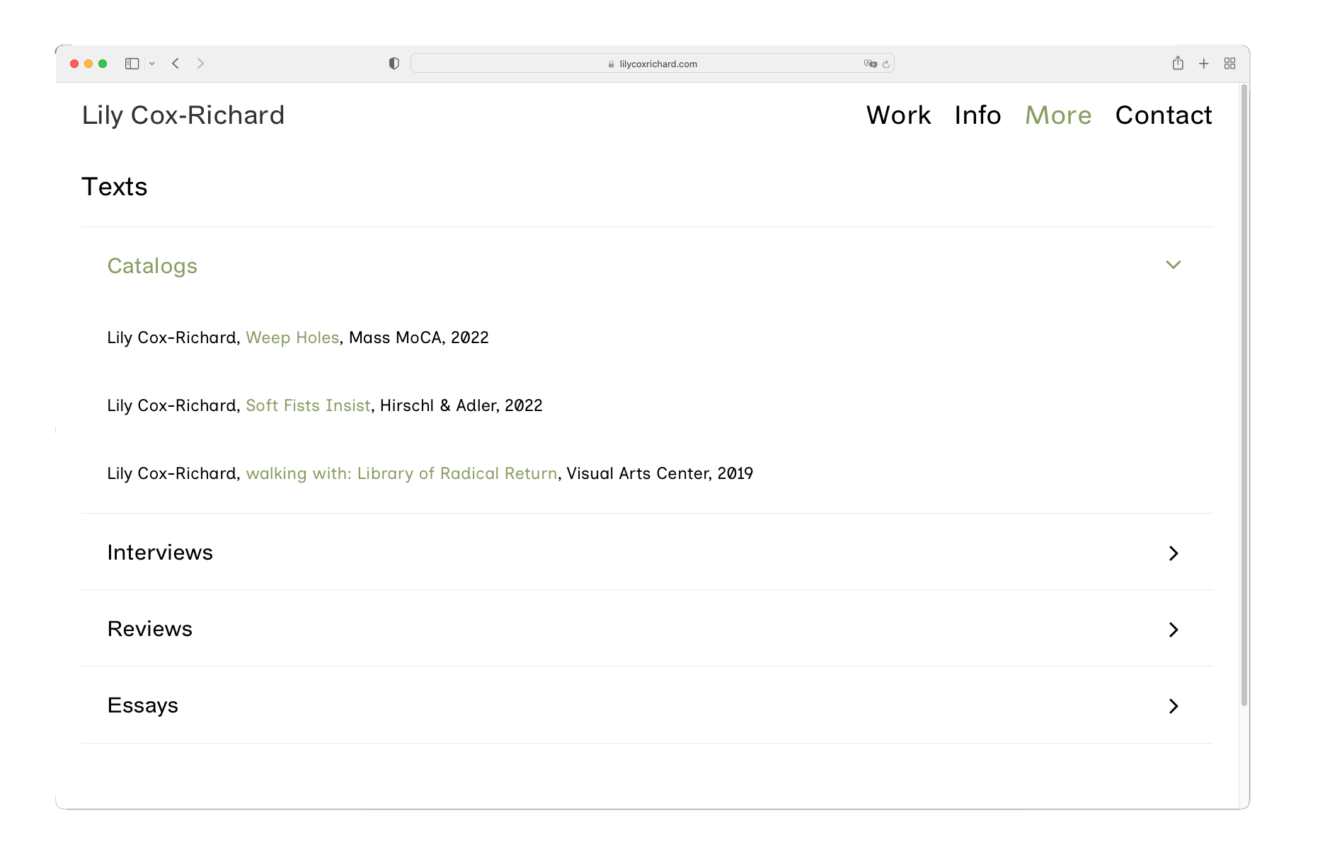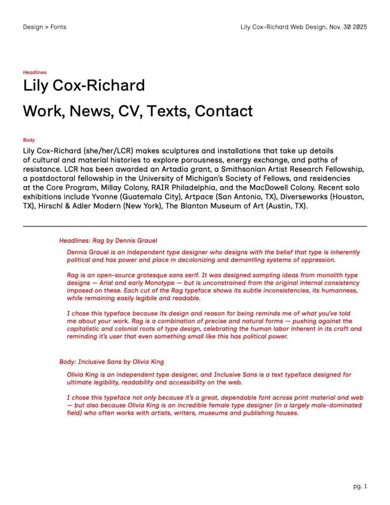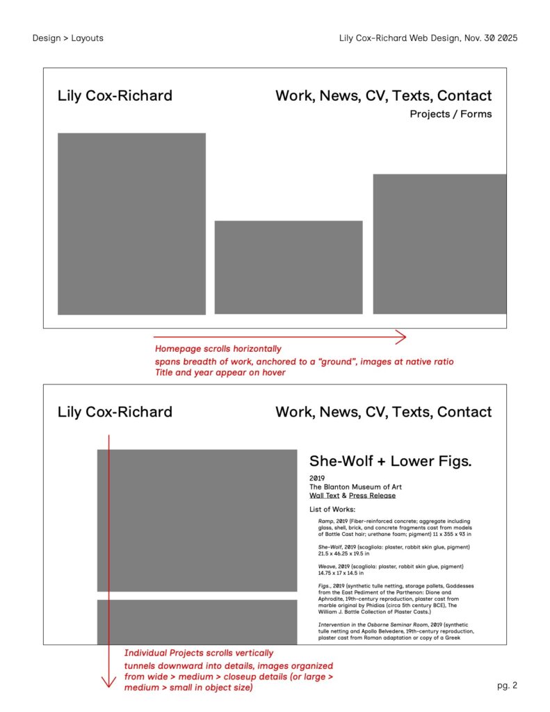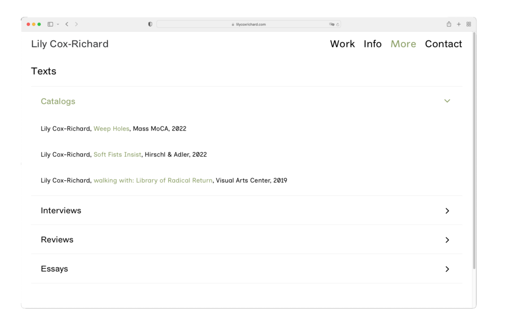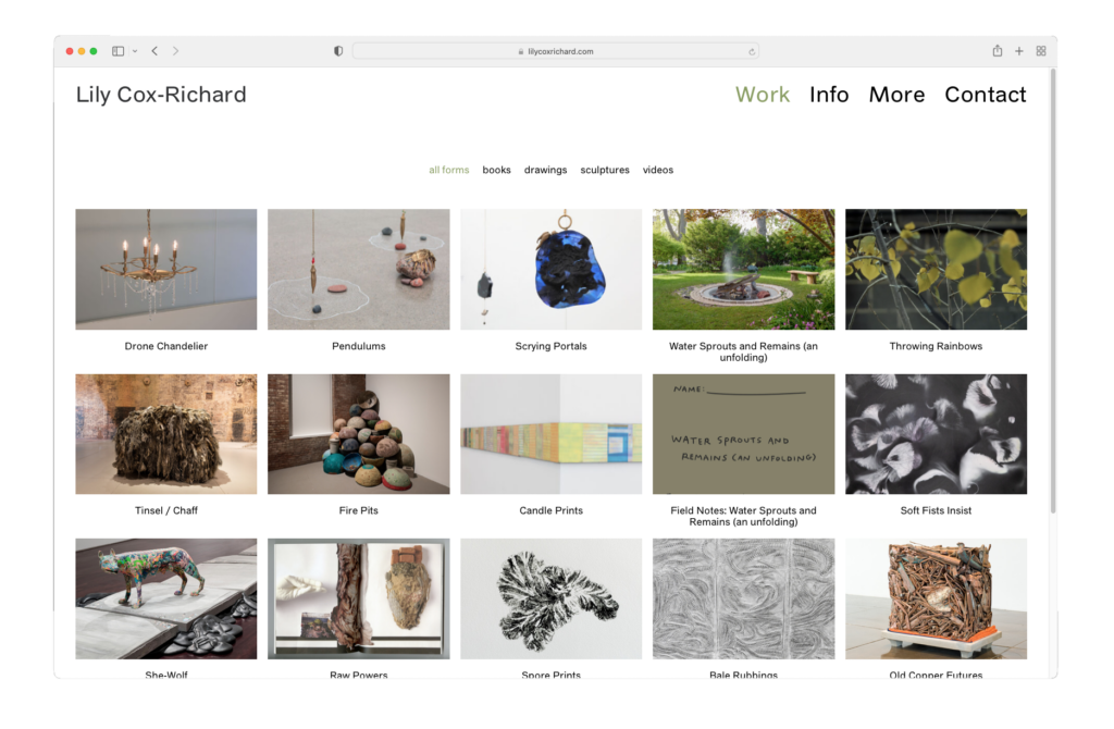 A new, clean design for Lily Cox-Richard’s artist website — which serves as a complete archive of her work, as well as a repository for her cultural impact like essays, interviews, and publications.